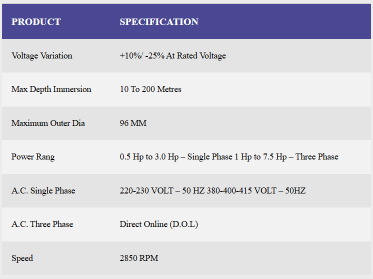 The V4 Submersible Pump is a reliable and efficient water pumping solution ideal for deep well applications. It features a robust water-lubricated motor pre-filled with clean water and anti-corrosion fluid for long-lasting performance. Built with a stainless steel (SS 304) stator shell and SS 420 motor shaft, it ensures durability even under challenging conditions. With a power range of 0.5 HP to 7.5 HP and a maximum immersion depth of 200 meters, it is perfect for irrigation, residential water supply, and pressure-boosting systems..