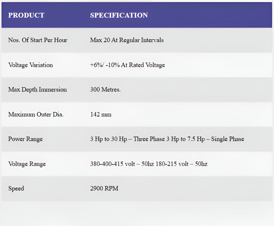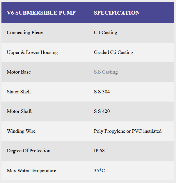 Designed for demanding applications, the V6 Submersible Pump combines precision engineering with heavy-duty construction. It features graded cast iron housing, SS 420 shafts, and PVC-insulated winding wire, ensuring reliable operation even in harsh conditions.