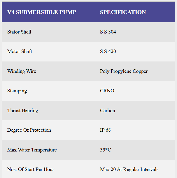 The V4 Submersible Pump is a reliable and efficient water pumping solution ideal for deep well applications. It features a robust water-lubricated motor pre-filled with clean water and anti-corrosion fluid for long-lasting performance. Built with a stainless steel (SS 304) stator shell and SS 420 motor shaft, it ensures durability even under challenging conditions. With a power range of 0.5 HP to 7.5 HP and a maximum immersion depth of 200 meters, it is perfect for irrigation, residential water supply, and pressure-boosting systems..